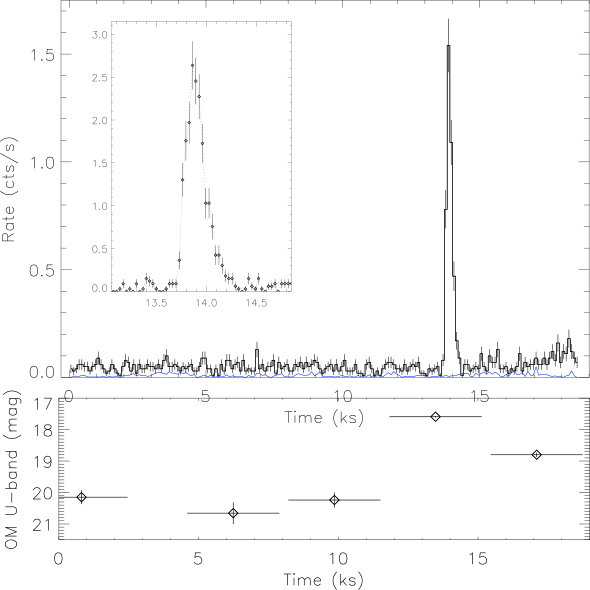 erg are emitted at X-ray energies during the event. The flare originates from a rather compact structure and is accompanied by a significant NUV/optical brightening in the corresponding OM image.