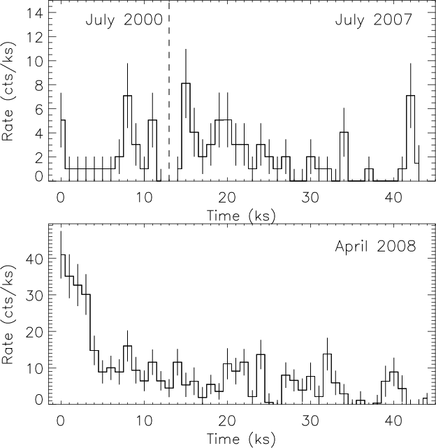 Upper panel: Chandra, ACIS-S (2000: BI-chip, 2007 FI-chip), 0.15-2.0 keV. Lower panel: