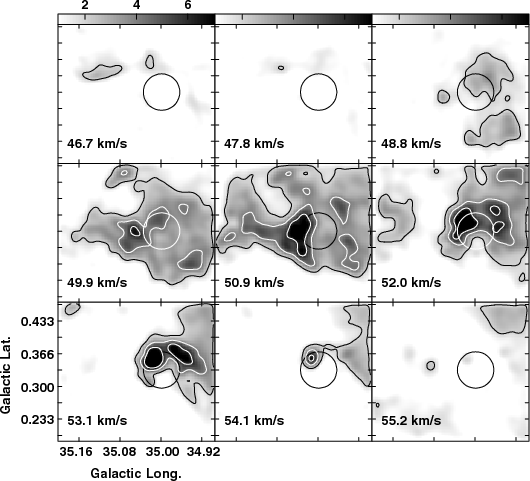 50 km s-1. The cloud appears to be fragmented into smaller molecular clumps that are seen right upon the PDR. Based on the distribution and morphology of the molecular gas between 47 and 55 km s-1, we suggest that the collect and collapse process may be occurring.