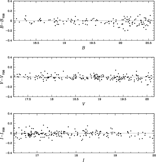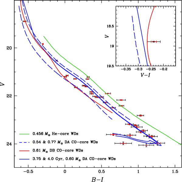 these WDs that are not matched by the reference isochrone. But both B-I and V-I colors suggest that the brightest object at V