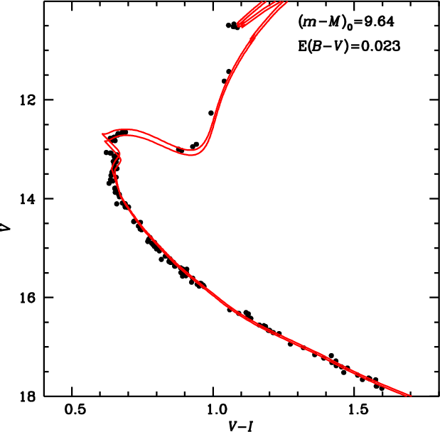 the He-core sequence also in V-I colors although the separation between the sequences is smaller in that case (and even smaller in B-V). As for the objects at the blue side of the isochrones, Fig. 7 displays the cooling track of a 0.61