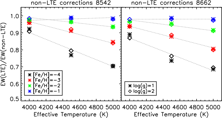 Figure 2: The ratio of LTE to full non-LTE equivalent widths for the different models for the second (8542 Å) CaT line in the left panel and the third (8662 Å) CaT line in the right panel. For the models with [Fe/H] < -2, non-LTE effects make significant contributions to the line-strength. The gray dotted lines indicate a simple fit to these values, using the metallicity and temperature of the model as input parameters. |