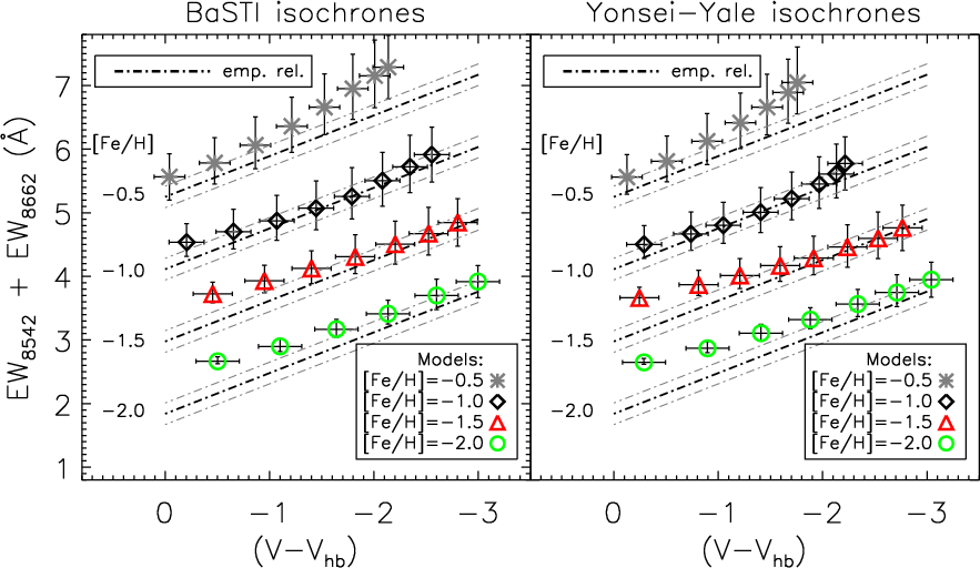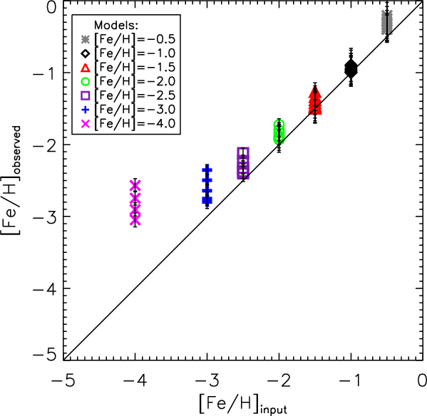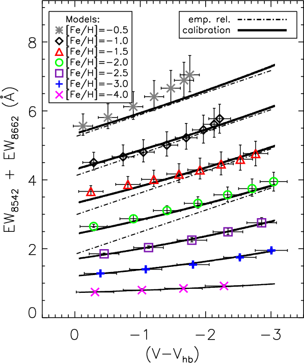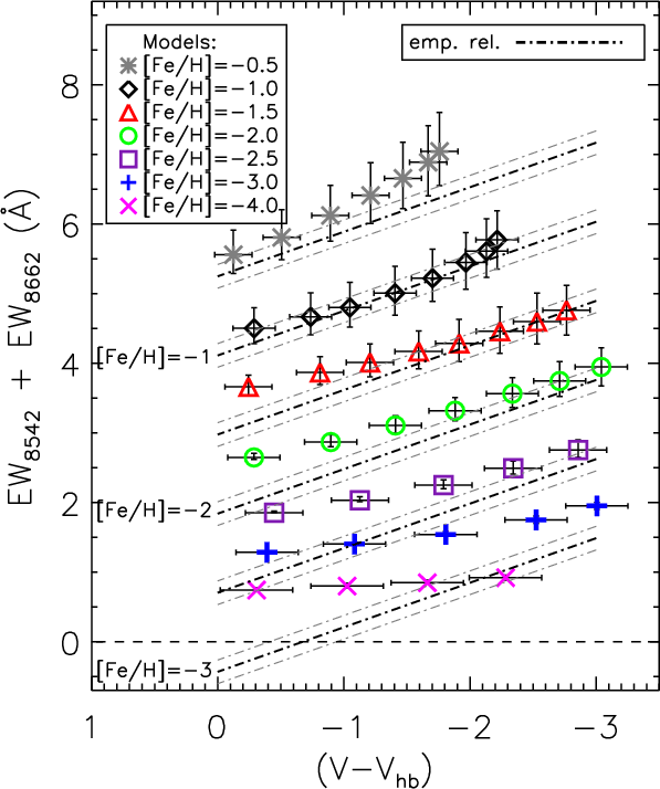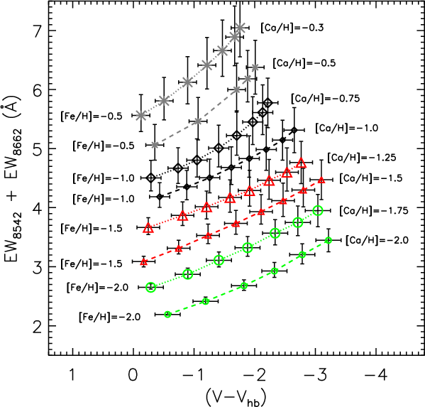 Figure 11: Synthetic spectra model predictions for [Ca/Fe] = +0.25 and [Ca/Fe] = 0.0. Models with the same [Fe/H] are plotted using the same symbols and colors. However, the synthetic spectra models with [Ca/Fe] = +0.25 are plotted with larger symbols and are connected by dotted lines whereas the models with [Ca/Fe] = 0.0 have smaller symbols and are connected by dashed lines. The [Fe/H] and [Ca/H] values for each set of models are indicated. |