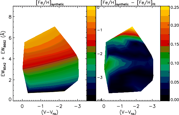 Figure 8: Two density plots showing the [Fe/H] values for the complete set of models ( left panel) and the difference between the [Fe/H] values of the models and their calculated [Fe/H] using the new calibration ( right panel). |