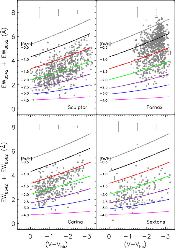 Figure 12: Equivalent widths vs. the height above the HB for the DART dataset members of Sculptor, Fornax, Carina and Sextans (gray circles) in separate panels and the new CaT calibration at different [Fe/H] (colored lines). Typical error bars for the observed DART RGB stars for three luminosity bins are given in the upper part of each panel. |