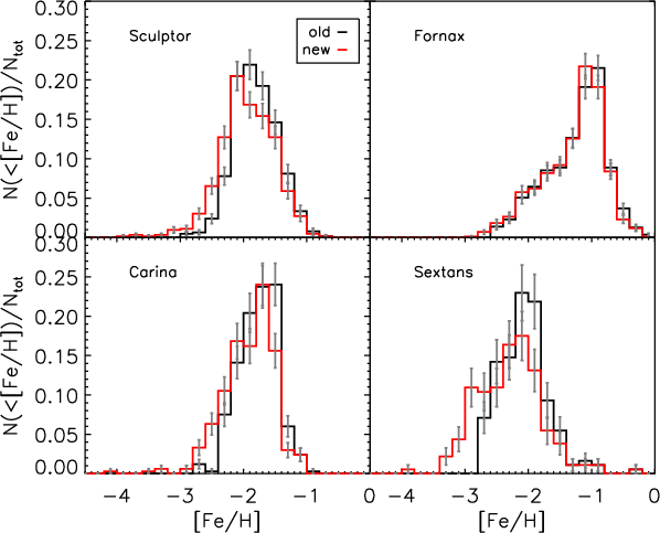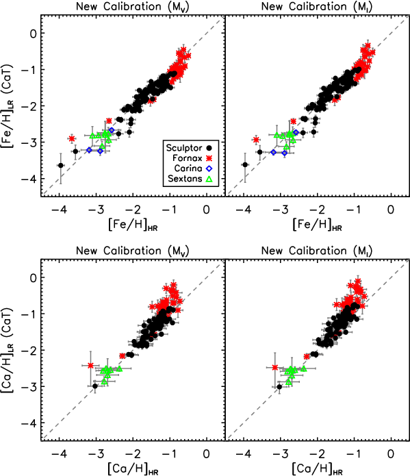 Figure 10: A comparison between the CaT [Fe/H] and the [Fe/H] values as determined from high-resolution measurements for the same stars from the DART survey, for both the old ( left panel) and new CaT calibrations ( right panel). Stars from the galaxies Sculptor (black circles), Fornax (red asterisks), Carina (blue diamonds) and Sextans (green triangles) are included. |