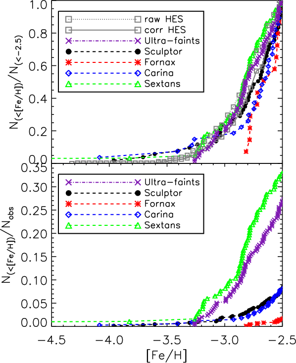 would statistically expect to find some RGB stars with [Fe/H] -3, if the distribution of metallicities in these systems follows that of the Galactic halo (Helmi et al. 2006).