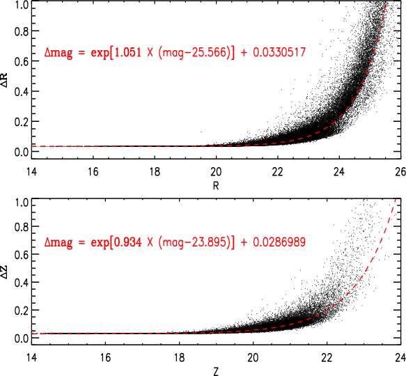 celestial coordinates, magnitudes in the R and Z