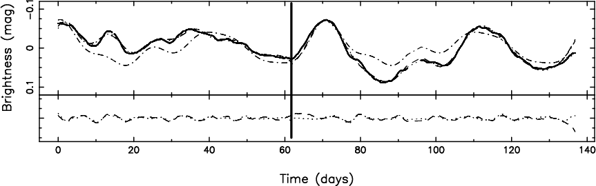 Figure 1: The CoRoT light curve of HD 50064 corrected for a linear downward trend (full line). For an explanation of the fits in different linestyles, see text. The y-axis of the lower panel is reduced by a factor 2 compared with the one in the upper panel. |