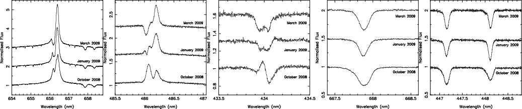 transforms from an inverse P Cygni profile in Oct. 08 to a modest P Cygni profile in Jan. 09