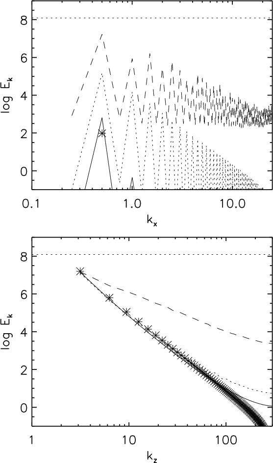 Figure 2: Evolution of the power spectrum. Spectra are shown at times t=0, 0.01, 0.02 and 0.03 with asterisks, solid lines, dots, and dashes, respectively. The total energy is collapsed onto the kx axis ( top) and kz axis ( bottom). The upper dotted line marks the initial power in the kx=0 background field, from which the energy of the unstable modes is drained. |