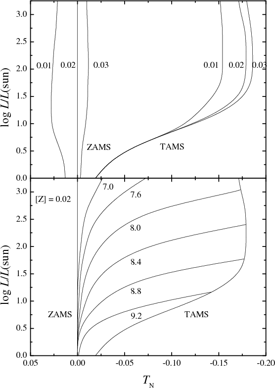 Here we list the complete evolutionary grids from Claret & Gimenez (1998), Schaller et al. (1992), Charbonnel et al. (1993) and Schaerer et al. (1993) used for this paper. They are normalized using the ZAMS model for [0.70:0.28:0.02], listed in Table 4, to the logarithmic effective temperature