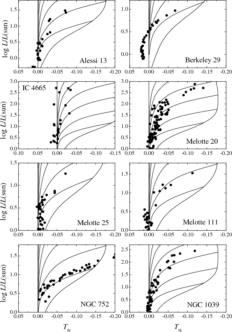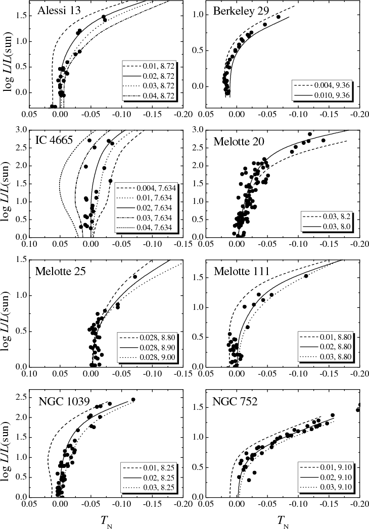 NGC 752: we used the parameters given by Anthony-Twarog et al. (2006) and Taylor (2007) for our analysis. Several publications indicate that NGC 752 exhibits a nearly solar metallicity. We find [Z] = 0.021(5) from data of 40 members.
