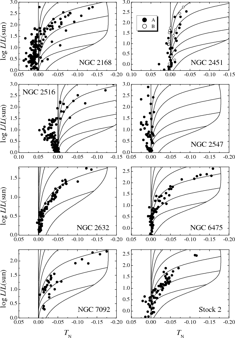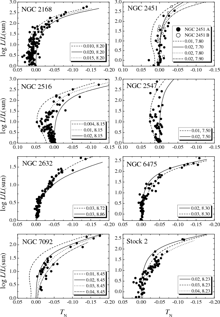 NGC 2451 A and B: Maitzen & Catalano (1986) were the first who suggested that NGC 2451 actually comprises of two separate clusters, which happen to lie in a common line of sight. This conclusion was proved by Röser & Bastian (1994) on the basis of kinematic data. Hünsch et al. (2003) estimated an age of 50 and 80 Myr, a distance of 206 and 370 pc and a reddening of 0.01 and 0.05 mag for the individual components. The rather low metallicity value of [Fe/H] = -0.50 published by Lyngå & Wramdemark (1984) does not take into account the ``binary nature'' of this cluster and is most certainly incorrect (Hünsch et al. 2003). We included the data of both components in one plot to show the similar metallicities and the rather young ages. Our metallicity estimation is [Z] = 0.020(5) and [Z] = 0.019(4) for NGC 2451 A and B, respectively.
