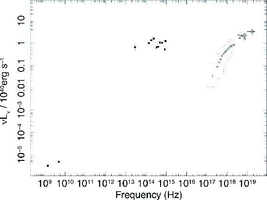 The multiwavelength spectral energy distribution (SED) is constructed by taking photometric data collected from NED (Fig. 13; see also Moran et al. 1999; Lira et al. 1999; Iwasawa et al. 2000). Only the data taken from a small aperture were used to minimize the contamination from the host galaxy, which can be large for this low luminosity nucleus. The IRAS data points are discarded since most of the IRAS fluxes are believed to originate in the galaxy (Lira et al. 1999).