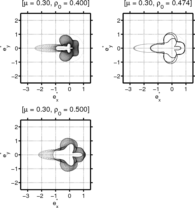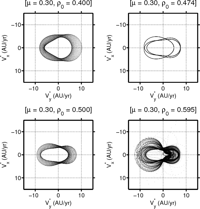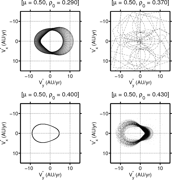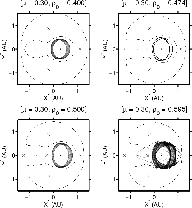 It is noteworthy that the property of the planet to remain within the zero-velocity contour is obviously tantamount to orbital stability, although it does not necessarily imply stability in the sense of quasi-periodicity. In fact, Eberle et al. (2008) encountered evidence that quasi-periodic orbits may even occur for planets outside the previously established stability region. This is a sincere motivation to revisit the onset of orbital instability by assessing the potential of different types of approaches. Our methodology for the study of orbital instability is discussed in Sect. 2. Detailed model simulations are given in Sect. 3, and our conclusions are presented in Sect. 4.