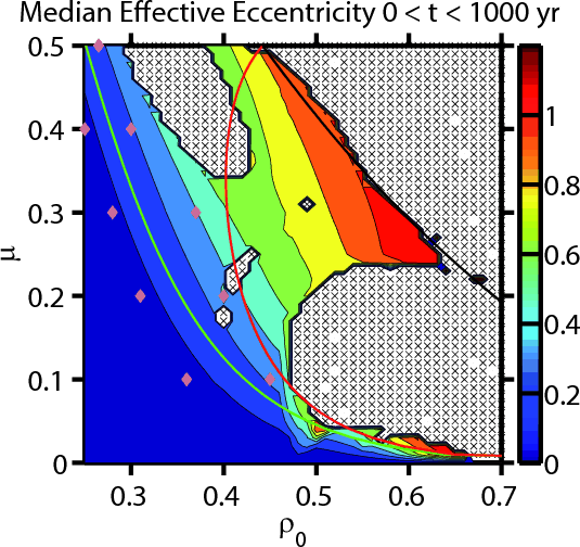 In Fig. 9 we show the median effective eccentricity over the 1000 year time period for all
