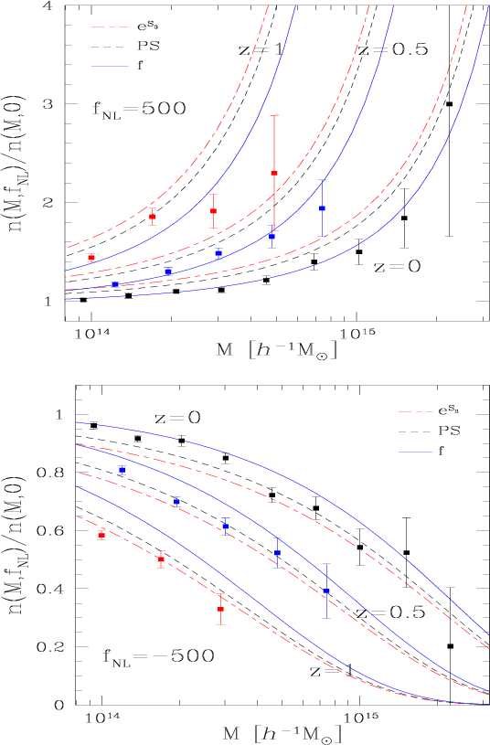 The effects of primordial non-Gaussianity on large-scale structures can be seen, for instance, through the mass function of virialized halos, especially in the high-mass tail as the steep falloff magnifies the sensitivity to initial conditions (Lucchin & Matarrese 1988; Colafrancesco et al. 1989; Grossi et al. 2007; Maggiore & Riotto 2009). This allows using the X-ray luminosity function of clusters to constrain the amount of non-Gaussianity (Amara & Refregier 2004).