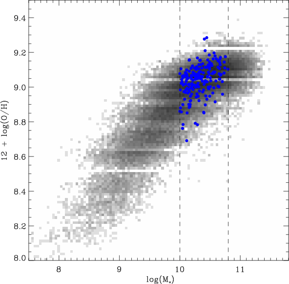 Peeples et al. (2009) studied 42 outliers (massive, metal-poor galaxies) of the