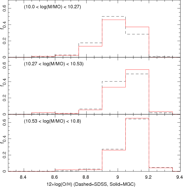 The above considerations have led us to analyse the presence of possible relics of such process in non-interacting, high-stellar-mass galaxies. To this aim, we have performed a morphological analysis of high quality images from the MGC of high-stellar-mass SDSS galaxies. Objects in this mass range have a more clearly defined morphology and so are suitable for exploring morphological disturbances associated with merger events. On the other hand, the oxygen abundance is a clear indicator of the gas phase metallicity and so is sensitive to the presence of recently formed stars.