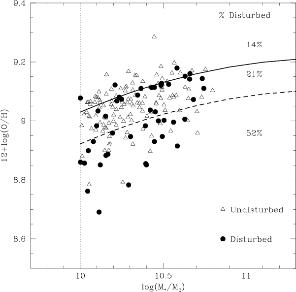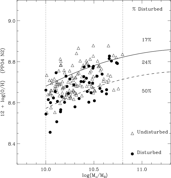 Similar effects have been reported by Michel-Dansac et al. (2008) and Ellison et al. (2008), where interacting pairs with strong morphological disturbance features have lower metallicities. This is also reinforced by the high mass outliers in the MZ relation exhibiting distorted morphologies (Peeples et al. 2009).