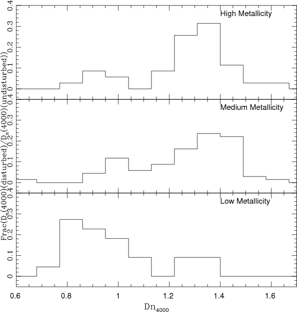 Figure 8: Fraction of stellar age indicator (Dn(4000)) for disturbed normalized to undisturbed galaxies (Dn(4000)(disturbed)/ Dn(4000)( undisturbed)) in the three metallicity ranges. |