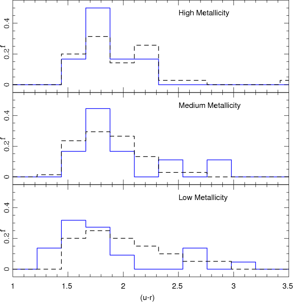 Figure 10: Colour index (u-r) for disturbed (solid) and undisturbed galaxies (dashed) in the three adopted metallicity ranges. |