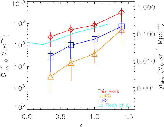 (LIRG) contribution increases by a factor of 10 (1.8) from z = 0.35 to z = 1.4.