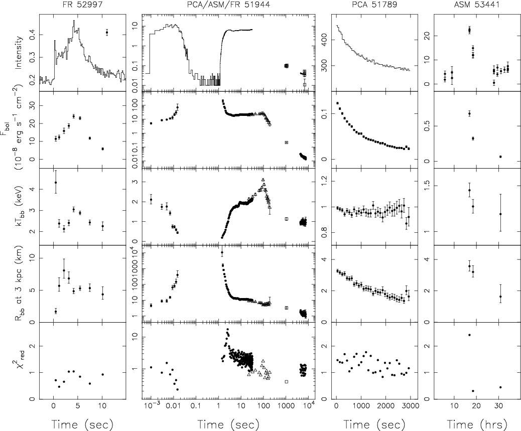 Under certain conditions, the local luminosity may reach or exceed the Eddington limit and matter may be pushed outward. As a result, the neutron star photosphere also moves outward. Consequently, the emitting area increases and the observed inferred black-body temperature drops. When the surge of energy release is over, the photosphere gradually returns to its pre-burst radius. During this phase, the emitting area decreases and the inferred temperature increases. During the expansion and contraction phase, the luminosity is expected to be close to the Eddington limit. After the photosphere recedes to its pre-burst radius (called ``touch-down'') cooling is typically observed. Such bursts are referred to as photospheric radius-expansion type I X-ray bursts (e.g., Lewin et al. 1984; Tawara et al. 1984, hereafter radius-expansion bursts).