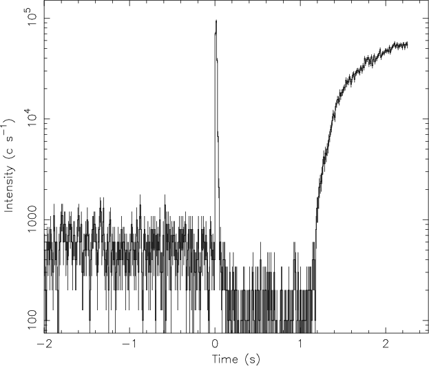 intensity rises rapidly on a time scale of seconds, and decays in an