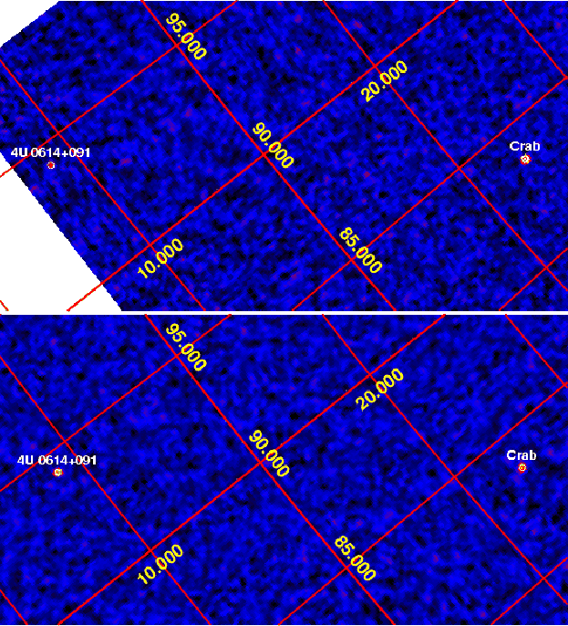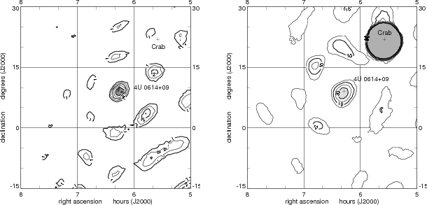 Figure A.1: Left: the cross-correlation map (6-15 keV) containing the burst observed from the direction of 4U 0614+091 on February 17, 1993 by EURECA/WATCH. The burst was contained in a modulation pattern integrated for 56.7 s. The contours are shown in Crab units and the averaged correlation at the position of 4U 0614+091 was 3.6 Crab. Note that the integration time is too short to give a detection of the Crab. Right: detection of the persistent emission from 4U 0614+091 by EURECA/WATCH. The skymap is based on data from the period of February to April 1993 in the energy band 6-12 keV. The contours show the cross correlation in units of mCrab (only positive correlation is shown). The ring-like structure around 4U 0614+091 is an artefact caused by the WATCH RMC detection principle. |