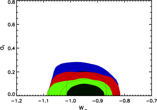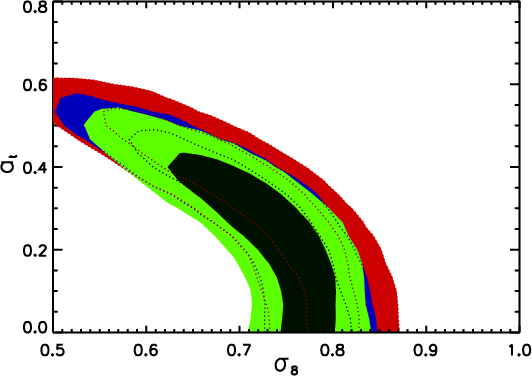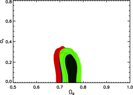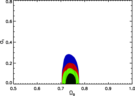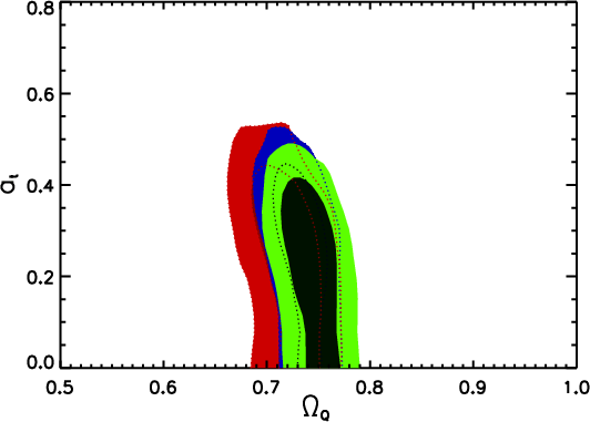 Tables 2-4 reveals that our results are not sensitive to different data combinations: using the three data sets (CMB, P(k), SN Ia) or using only two (either CMB and P(k) or CMB and SN Ia) leads to nearly identical constraints, differences in preferred parameters being at most 1.5