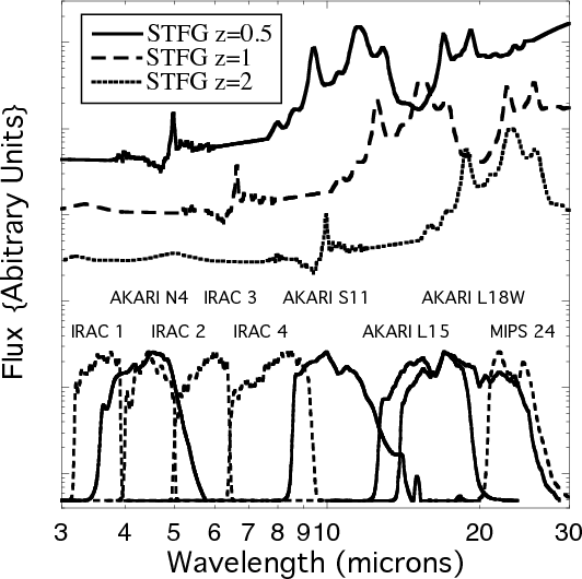 data and in particular to target Spitzer fields in the above mentioned conspicuous wavelength ``gap'', at wavelengths of 11, 15 and 18 m. The FU-HYU observations fill in vital gaps in the wavelength coverage (see Fig. 1) and provide invaluable insight into the connection between ISO and Spitzer