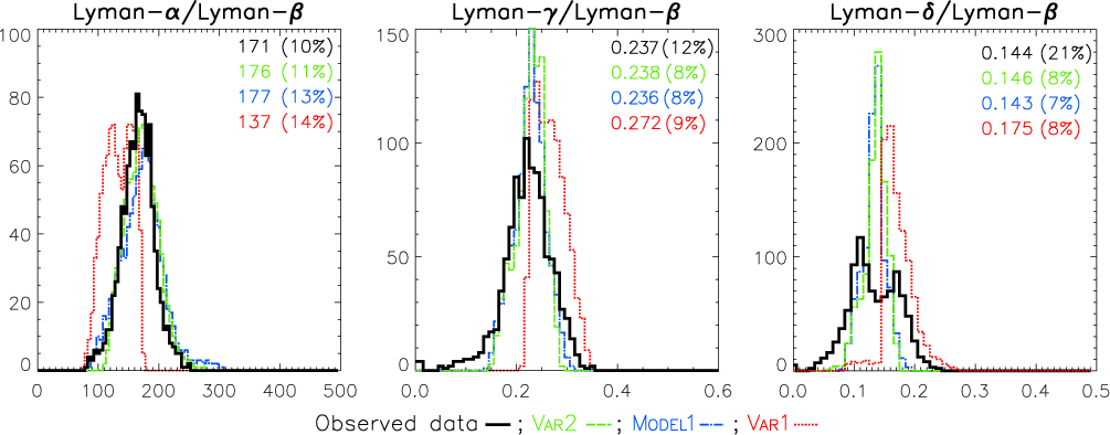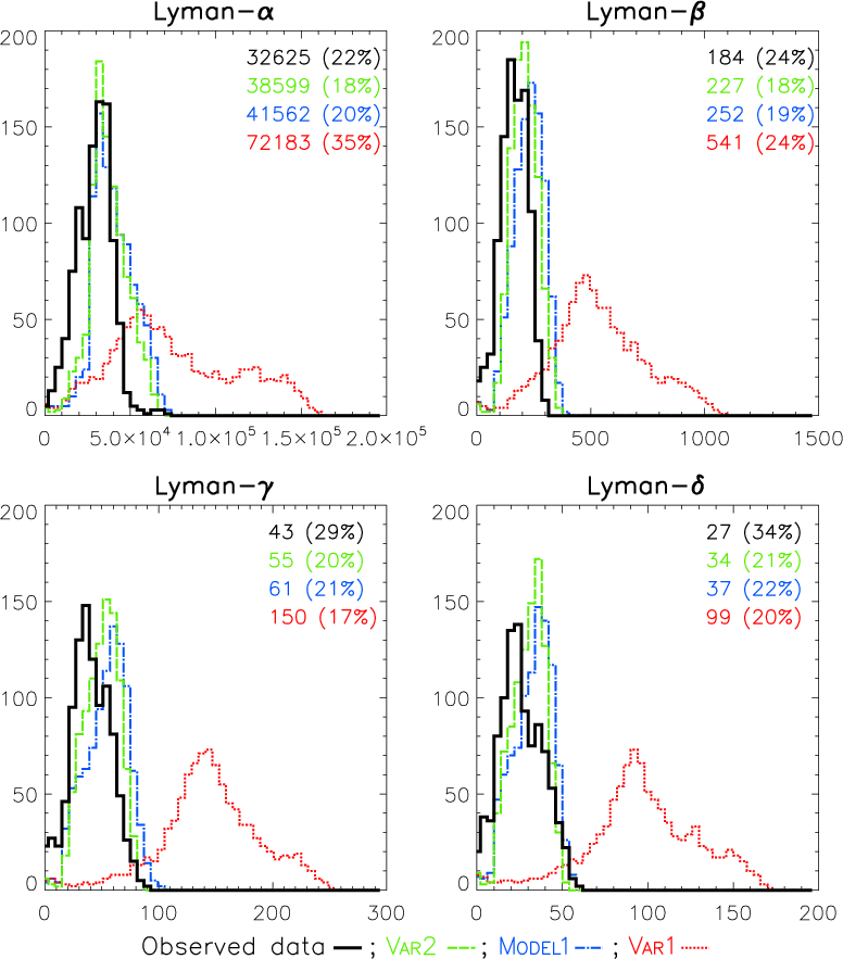Although it was not the purpose of this paper to find a multi-thread model with the best match of the synthetic and observed Lyman spectra, we have demonstrated very good agreement between the observed spectra and the synthetic spectra resulting from M ODEL1. The set of input parameters of the individual 2D thread of the multi-thread M ODEL1 (see Table 2) was obtained by Gunár et al. (2007), who used a trail-and-error method to find the model with the best agreement between the actual shape of the synthetic and observed Lyman line profiles. These authors used a part of the observed spectra also analysed in the present study. The approach of Gunár et al. (2007) of matching the shapes of individual synthetic Lyman line profiles with the observed profiles is significantly different from the analysis of the statistical criteria applied to all the data sets of synthetic and observed Lyman spectra.