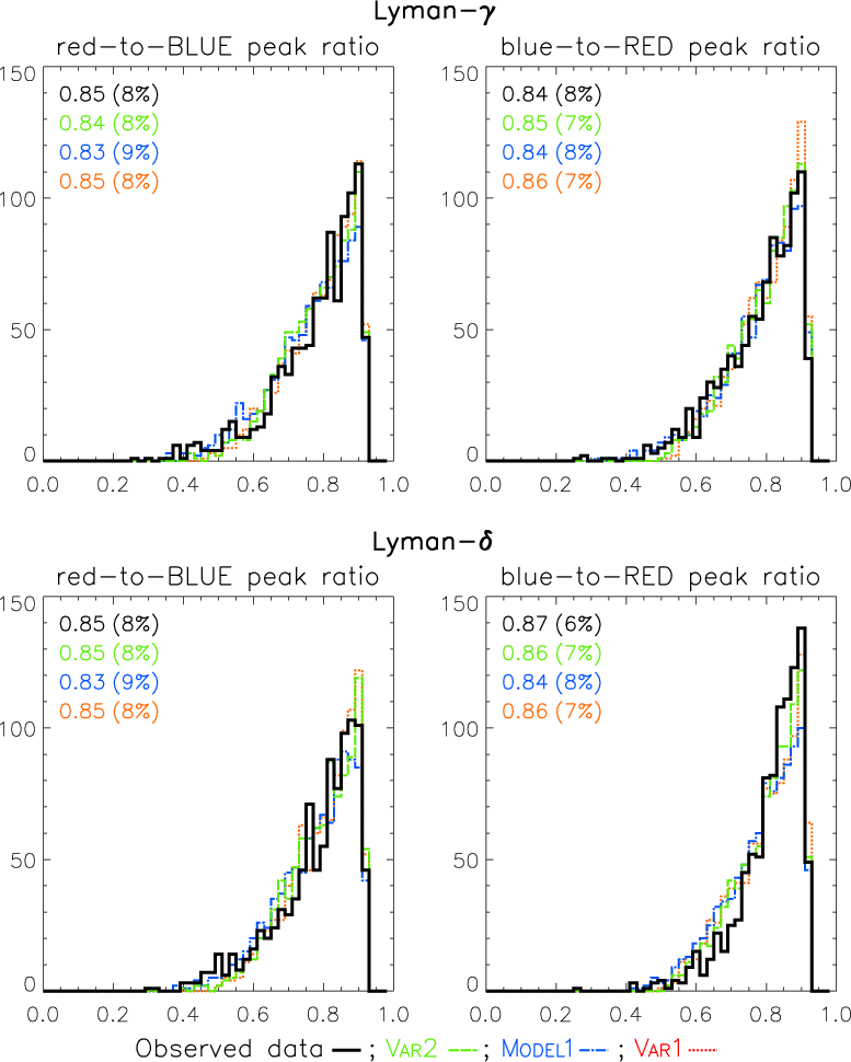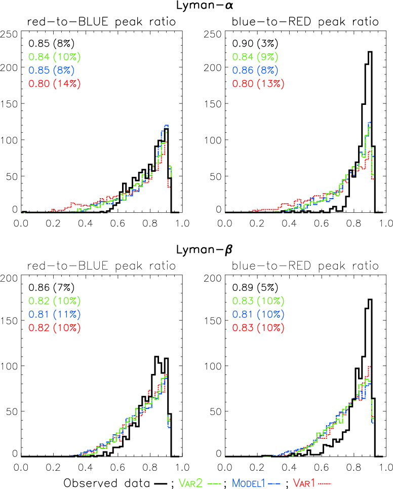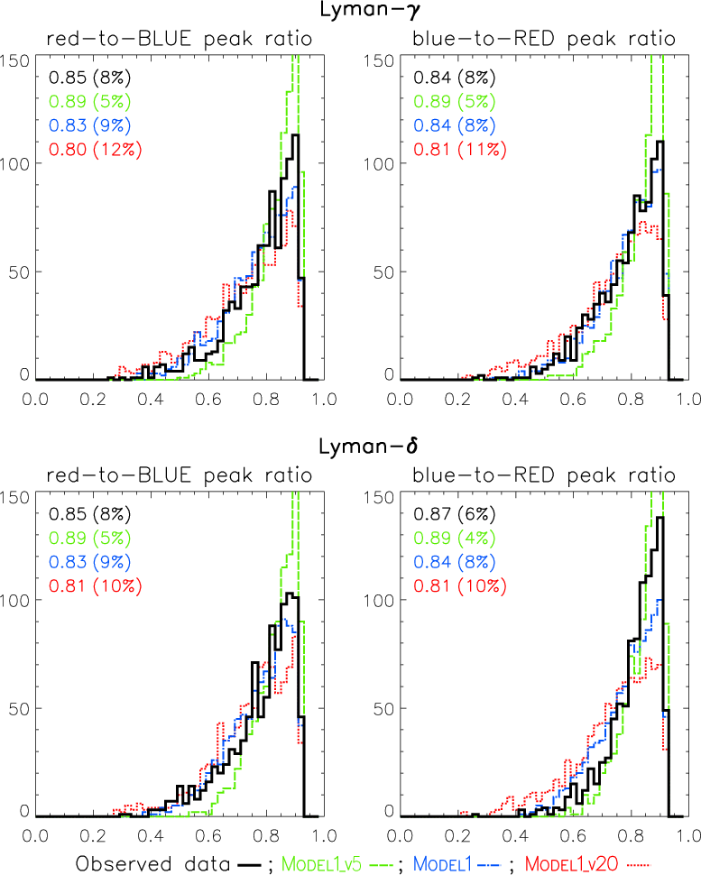 The asymmetries of the Lyman line profiles are represented by the red to blue peak intensity ratio criterion (Sect. 4.3). This is mostly sensitive to the choice of the LOS velocity intervals (Figs. 8 and 9), so is useful for assessing of the LOS velocities of individual threads of the multi-thread models.