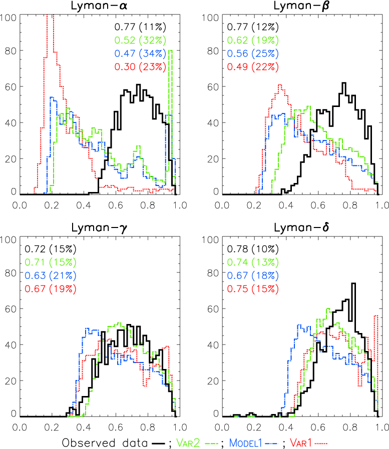The depth of the reversed Lyman line profiles is described by the centre-to-mean-peak intensity ratio criterion (Sect. 4.4). The synthetic spectra obtained by multi-thread modelling are unable to reproduce the statistics of the observed Lyman spectra (Fig. 10). We did not succeed in finding a good fit to the observed spectra by any realistic combination of the input parameters of the multi-thread models. This comes from very high peak intensities compared to the observed profiles. The central intensities of the observed and synthetic profiles are in good agreement. Although the peak intensities of the synthetic line profiles are much higher than observed ones, the integrated intensities of the observed and synthetic lines are in good agreement, because of the sharpness of the synthetic line peaks and smaller line-width of the synthetic Lyman lines, compared to the observed spectra.