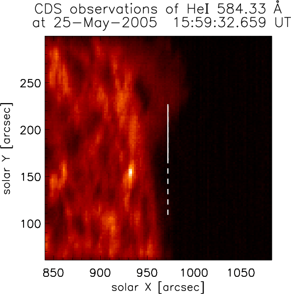 Figure 1: Raster obtained by SOHO/CDS (Coronal Diagnostic Spectrometer) (Harrison et al. 1995) in the He I 584.33 Å line on May 25, 2005 between 15:59:33 and 16:52:26 UT. The position of the SUMER slit is marked by the vertical bar crossing the southern leg of the prominence. Full-line part of the bar marks the working part of detector A. |