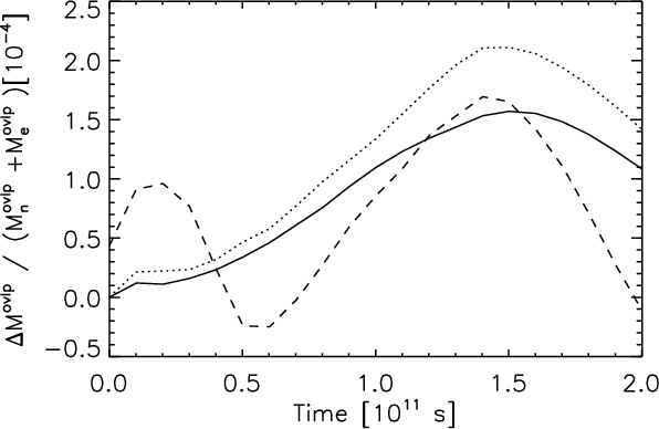 Because the communication between the two grid patches involves interpolation, flows across the Yin-Yang boundary cause some small amount of non-conservation of conserved quantities. However, even for the (in this respect) severe test case of the rotating polytrope involving large flows across the Yin-Yang boundary, we observe only a small amount (less than one percent) of non-conservation.