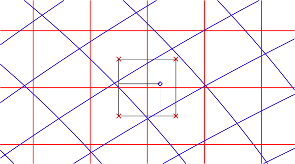 Figure 1: An axis-free Yin-Yang grid configuration plotted on a spherical surface. Both the Yin (red) and Yang (blue) grid are the low latitude part of the normal spherical polar grid and are identical in geometry. The Yang grid is obtained from the Yin grid by two rotations, and vice versa. |