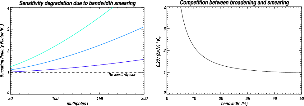 We know that a dedicated B-mode bolometric interferometer will have to use the wide spectral detection band of its bolometers to be competitive with imaging experiments. On the other hand, the bandwidth is often considered as a crucial issue in radio-interferometry; if the raw sensitivity of radio interferometer detectors increases as the square root of the bandwidth, there is a secondary effect, well known as bandwidth smearing, which can largely degrade the global sensitivity. When the signals originating in a point source interfere after being collected by two broadband receivers, the resulting fringe pattern is smeared by an envelope whose amplitude depends on the bandwidth, consequently leading to a degradation in the signal-to-noise ratio - see for instance (Thompson et al. 2001). We later see that these two main characteristics remain in bolometric interferometry: the bolometers' sensitivity also increases as the square root of the bandwidth, and a bandwidth smearing of the observables, the visibilities, degrades the global sensitivity of the instrument (however, because the observation of CMB angular correlations requires a poorer spatial resolution than the observation of point sources to which classical radio-interferometers are mostly dedicated, this smearing will lead to a less critical sensitivity loss). But we also see that an additional kind of bandwidth issue occurs, because in bolometric interferometry, visibilities are not measured directly but by solving a linear problem.