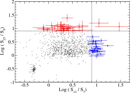 Methods. We propose a single-colour selection method to identify such galaxies, using two mid-IR flux ratios at 11-to-7
