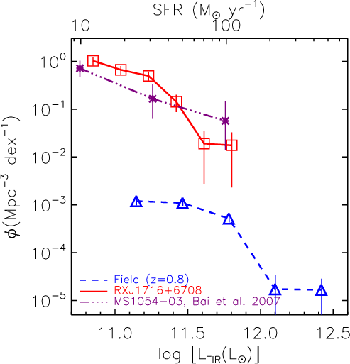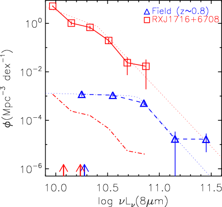 Methods. We construct restframe 8 m IR LFs in the cluster region RXJ1716.4+6708 at z=0.81,