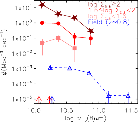 In this work, we compare restframe 8 m LFs between cluster and field regions at z=0.8 using data from the AKARI.