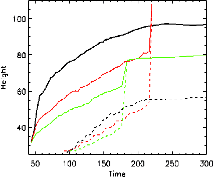 Figure 3: Height-time profiles of the apex of the emerging field (solid) and the flux rope (dashed) in experiments B1 (black), B2 (red) and B3 (green). |