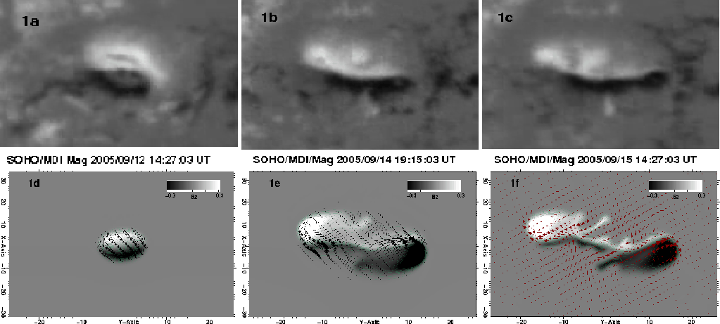 Figure 1 (panels 1a-1c) shows the evolution of the emerging field in the NOAA AR 10808. At the beginning (panel 1a) there is a clear appearance of a bipolar region at the photosphere with a North-South orientation. The two polarities progressively diverge from each other in an approximate East-West direction (panels 1b, 1c). During the evolution of the system, two elongated tails or tongues are formed in the wake of the two polarities (panel 1b). Initially, the tails possess an apparently coherent shape but as time goes on their structure appears to be more fragmented on the two sides of the PIL (panel 1c).