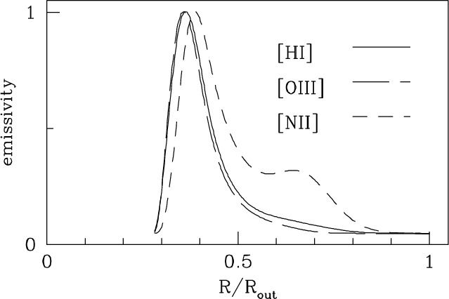 - In the photoionization model of the outer nebula, the [O III] 4363 Å line is underestimated by an order of magnitude, which is another argument for it not belonging to the outer main ring.