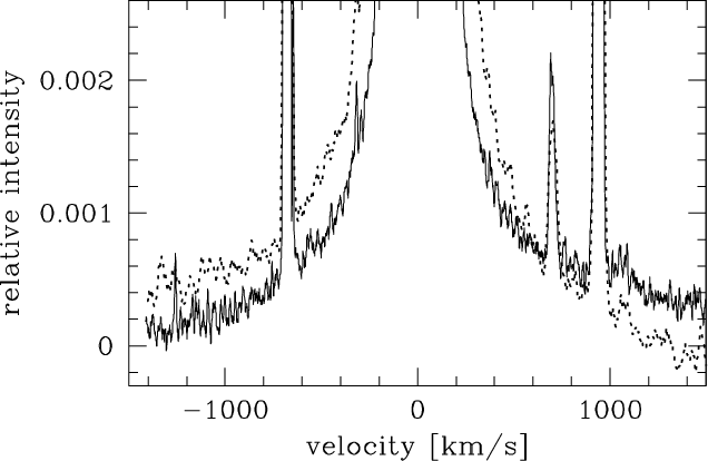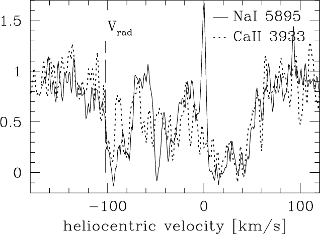 - The velocity is corrected for the radial velocity of the object of -112.2 km s-1 (Durand et al. 1998) and barycentric velocity for the moment of observations of -10.4 km s-1 for UVES and -22 km s-1 for ARGUS.