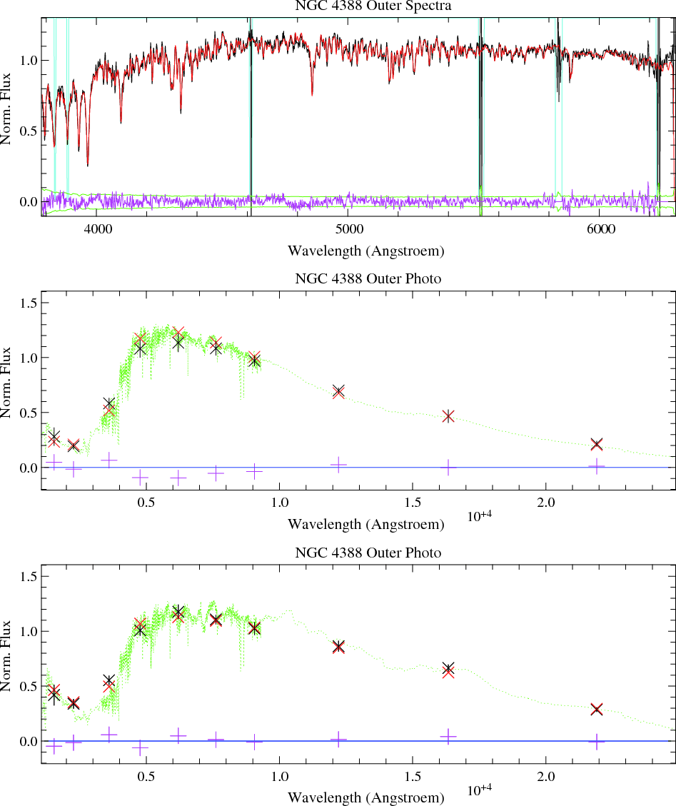 NGC 4388 outer region fits: top panel: spectra (black) and best fit (red) obtained from inversion with