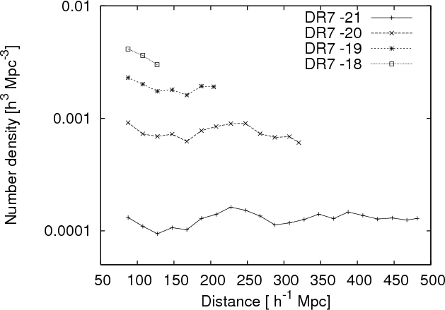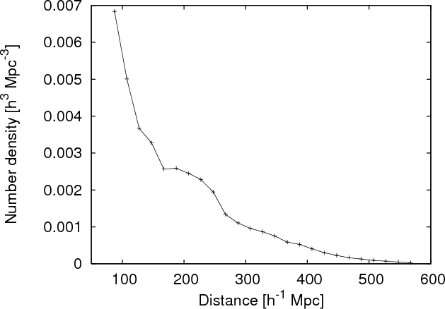 Figure 2: The number density of groups in the SDSS DR7 flux-limited sample as a function of distance from the observer. |