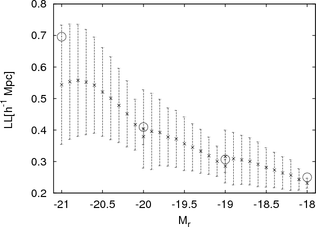 As shown in Papers I and II, it is actually the density of galaxies in groups, not in the general field, that determines the choice of group selection parameters. There exists a close correlation between luminosities of galaxies in groups and their positions within groups: bright galaxies are concentrated close to the centre, and less bright companions lie in the outskirts (for an early analysis of this luminosity-density correlation see Einasto et al. 1974, for a recent discussion see Paper I). In Papers I and II we found that while constructing group catalogues, a slightly increasing linking length with distance has to be used.